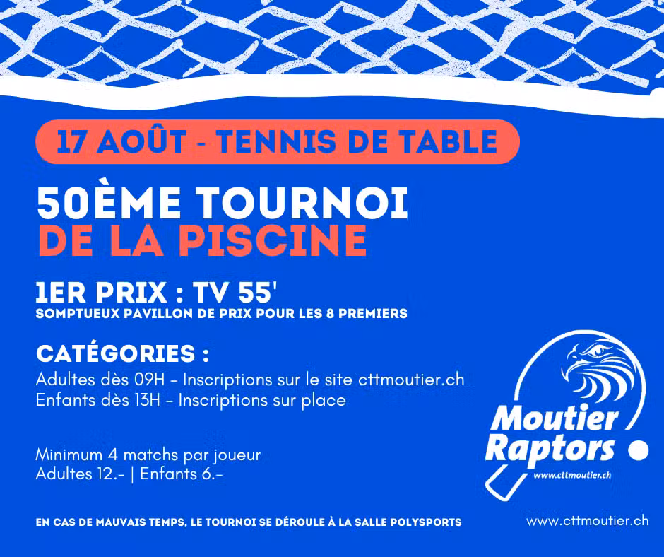 Tournoi de la piscine Moutier 17 août 2024-8h00 - 17h00 Piscine de Moutier Chem. de la Piscine, Moutier Plus d'informations sur cet article :https://anjtt.ch/tournoi-de-la-piscine-2024-cttm/ 12CHF